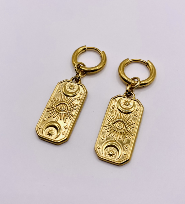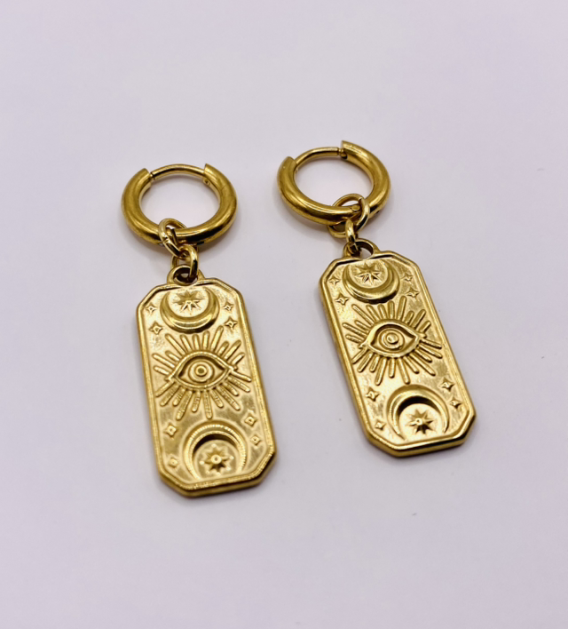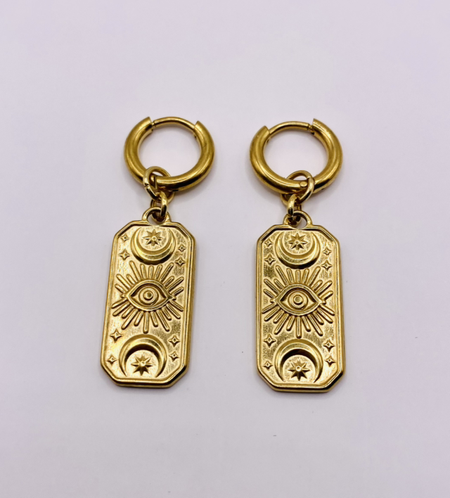 Élégantes et lumineuses, nos boucles d’oreilles « Cassiopée » en acier inoxydable doré sont assemblées à la main dans notre atelier en Bretagne.