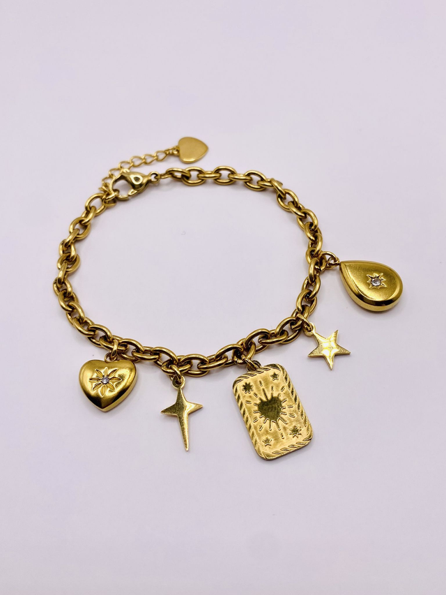 Notre bracelet charms "Amor" en acier inoxydable doré est assemblé à la main dans notre atelier en Bretagne, et se distingue par ses charms délicats ornés de symboles mystiques. Conçu en acier inoxydable, il est très résistant, hypoallergénique et inoxydable, idéal pour accompagner toutes vos journées sans craindre l’eau claire ni l’usure du temps. Les pendentifs, sélectionnés pour leurs couleurs et leur symbolique unique, rendent chaque pièce singulière et authentique.