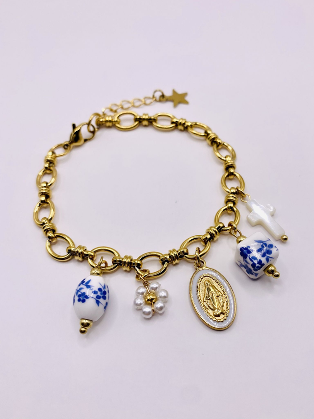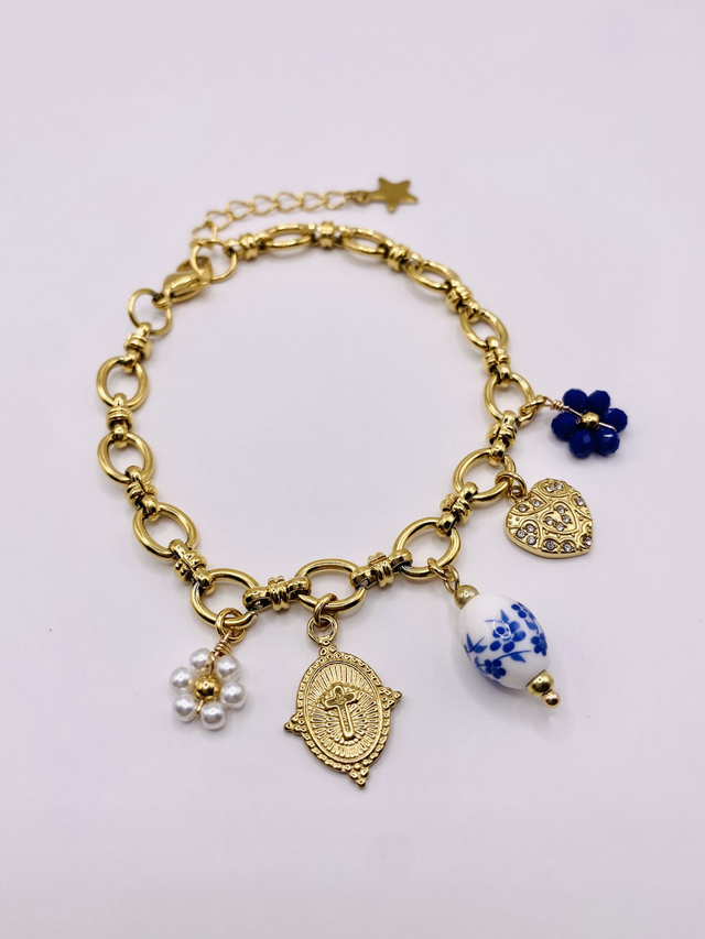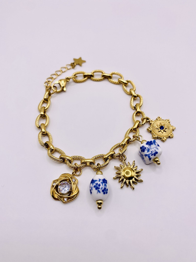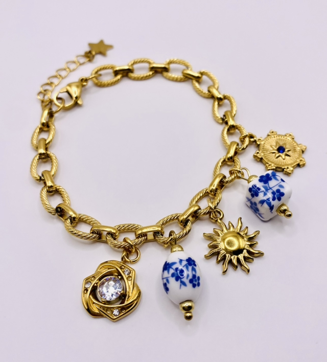 Notre bracelet charms "Portia" en acier inoxydable doré est assemblé à la main dans notre atelier en Bretagne, et se distingue par ses charms délicats ornés de symboles mystiques. Conçu en acier inoxydable, il est très résistant, hypoallergénique et inoxydable, idéal pour accompagner toutes vos journées sans craindre l’eau claire ni l’usure du temps. Les pendentifs, sélectionnés pour leurs couleurs et leur symbolique unique, rendent chaque pièce singulière et authentique.
