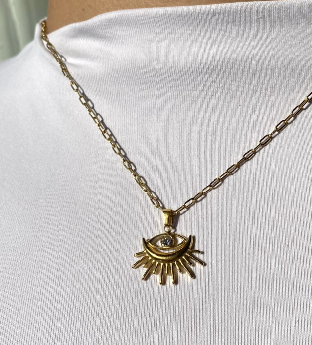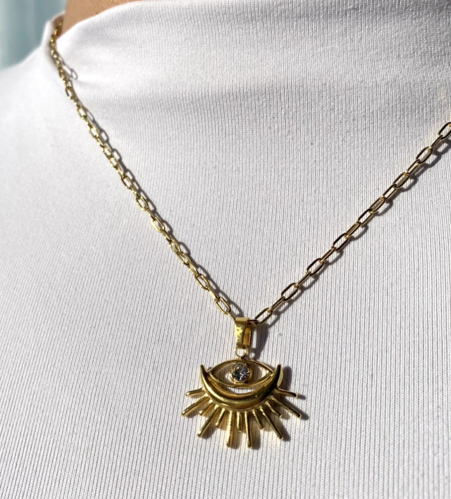 Élégant et lumineux, notre collier "Athéna" en acier inoxydable doré est assemblé à la main dans notre atelier en Bretagne.