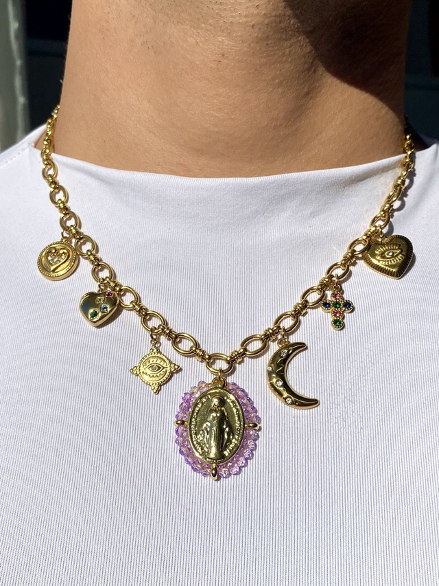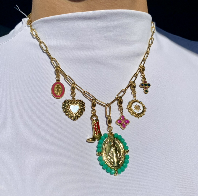 Notre collier charms "Maria" turquoise en acier inoxydable doré est assemblé à la main dans notre atelier en Bretagne, et se distingue par ses charms délicats à pendentifs interchangeables ornés de symboles mystiques. Conçu en acier inoxydable, il est très résistant, hypoallergénique et inoxydable, idéal pour accompagner toutes vos journées sans craindre l’eau claire ni l’usure du temps. Les pendentifs, sélectionnés pour leurs couleurs et leur symbolique unique, rendent chaque pièce singulière et authentique.