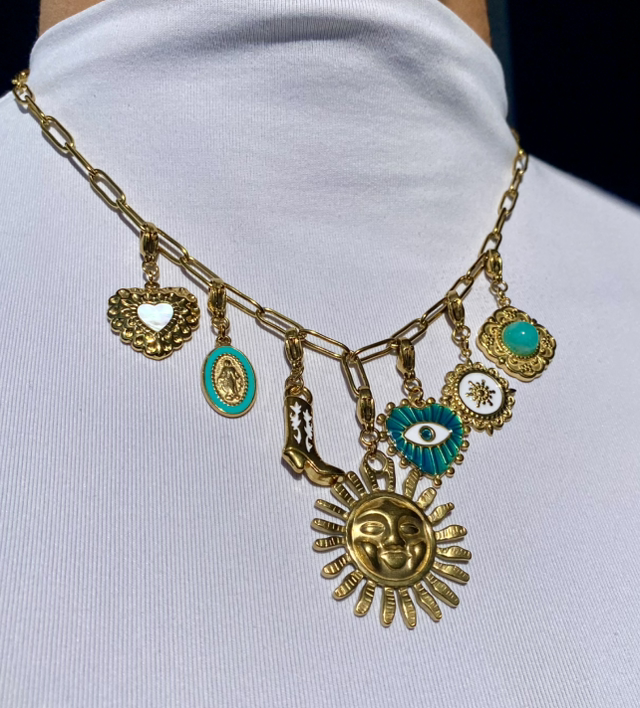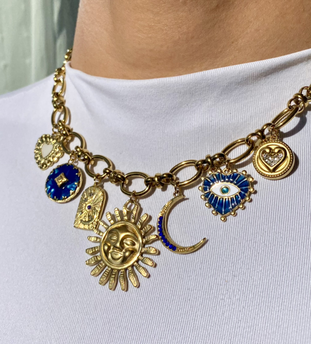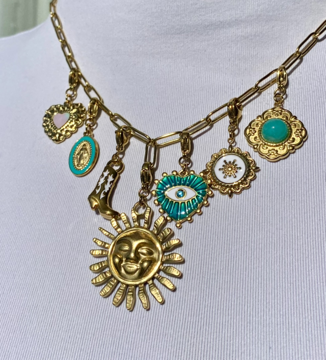 Notre collier charms "Sól" en acier inoxydable doré est assemblé à la main dans notre atelier en Bretagne, et se distingue par ses charms délicats ornés de symboles mystiques. Conçu en acier inoxydable, il est très résistant, hypoallergénique et inoxydable, idéal pour accompagner toutes vos journées sans craindre l’eau claire ni l’usure du temps. Les pendentifs, sélectionnés pour leurs couleurs et leur symbolique unique, rendent chaque pièce singulière et authentique.
