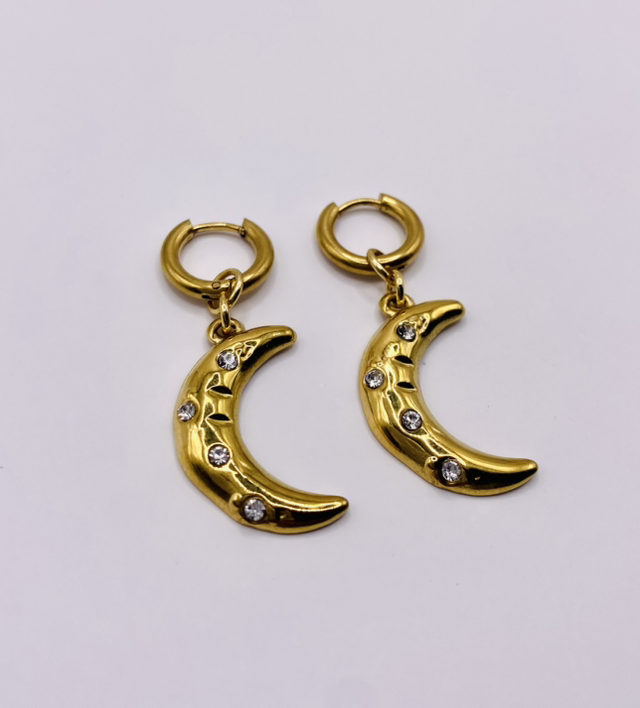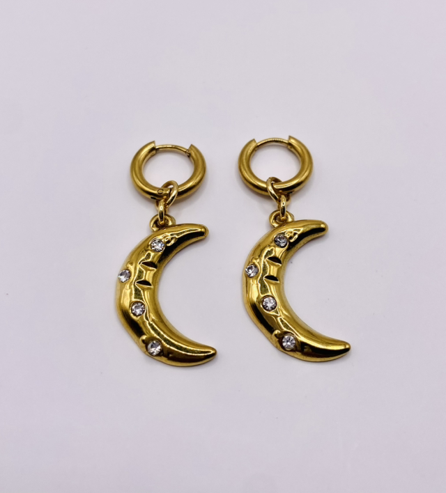 Élégantes et lumineuses, nos boucles d’oreilles « Moon » en acier inoxydable doré sont assemblées à la main dans notre atelier en Bretagne.